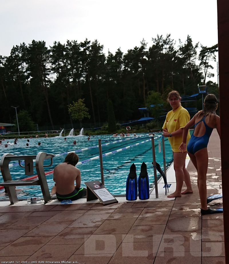 Es wir darum gebeten, das möglichst wenige Eltern als Begleitpersonen mit ins Bad kommen, da die Anzahl der Personen begrenzt ist, die ins Bad dürfen. Es besteht die Möglichkeit, sich für die Zeit am/im DLRG Heim aufzuhalten.